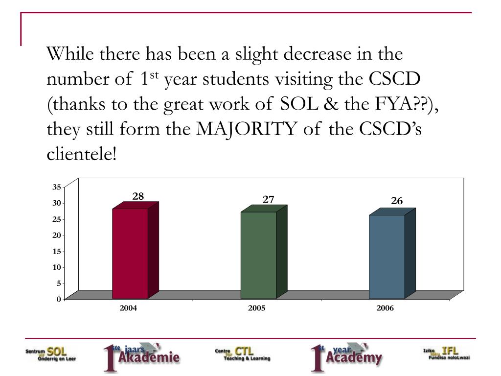 While there has been a slight decrease in the number of 1st year students visiting the CSCD (thanks to the great work of SOL & the FYA??), they still form the MAJORITY of the CSCD’s clientele!