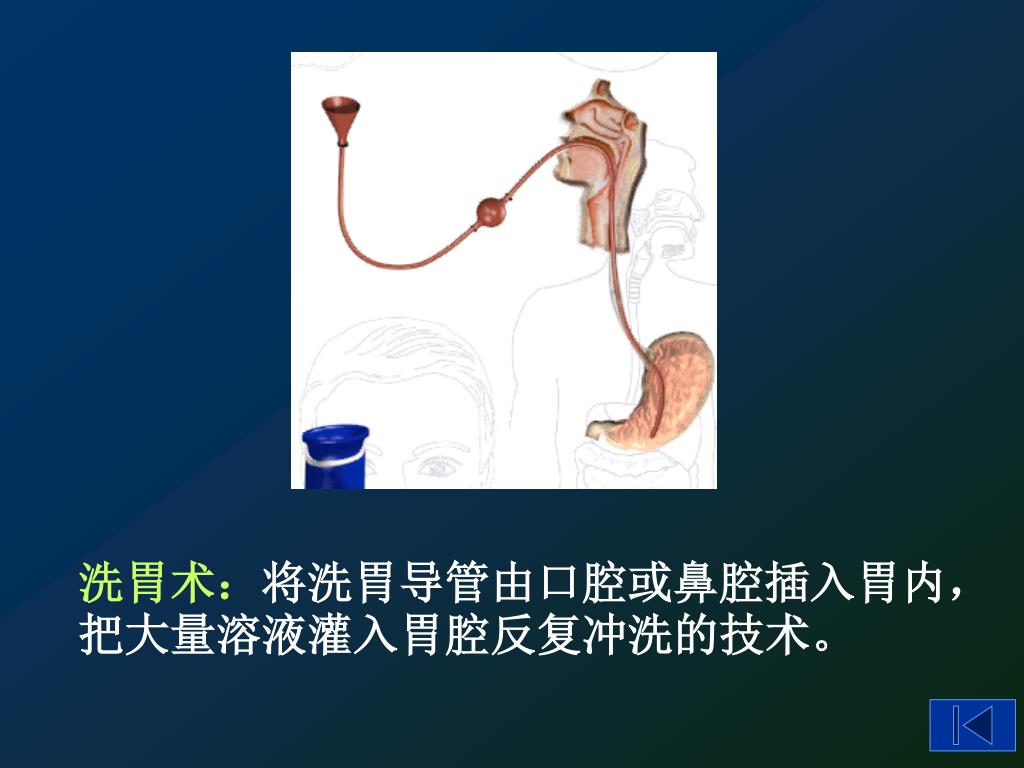 洗胃术:将洗胃导管由口腔或鼻腔插入胃内,把大量溶液灌入胃腔反复冲洗的技术。洗胃术:将洗胃导管由口腔或鼻腔插入胃内,把大量溶液灌入胃腔反复冲洗的技术。