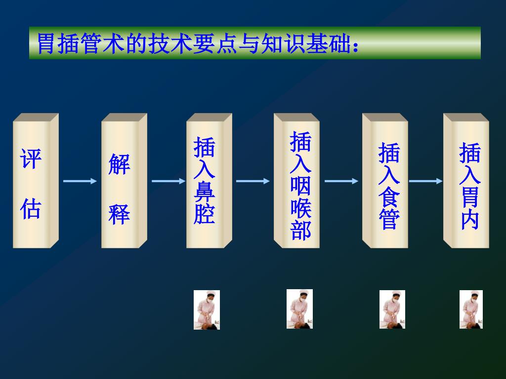 胃插管术的技术要点与知识基础: 评 估 解 释 插入鼻腔 插入咽喉部 插入食管 插入胃内