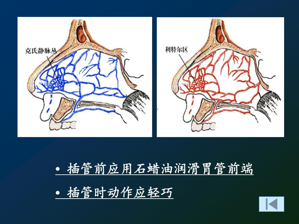 • 插管前应用石蜡油润滑胃管前端 • 插管时动作应轻巧