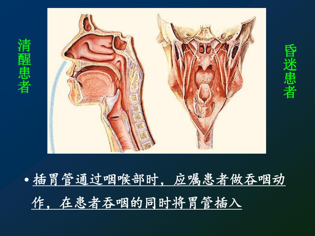 清醒患者 昏迷患者 • 插胃管通过咽喉部时,应嘱患者做吞咽动 作,在患者吞咽的同时将胃管插入