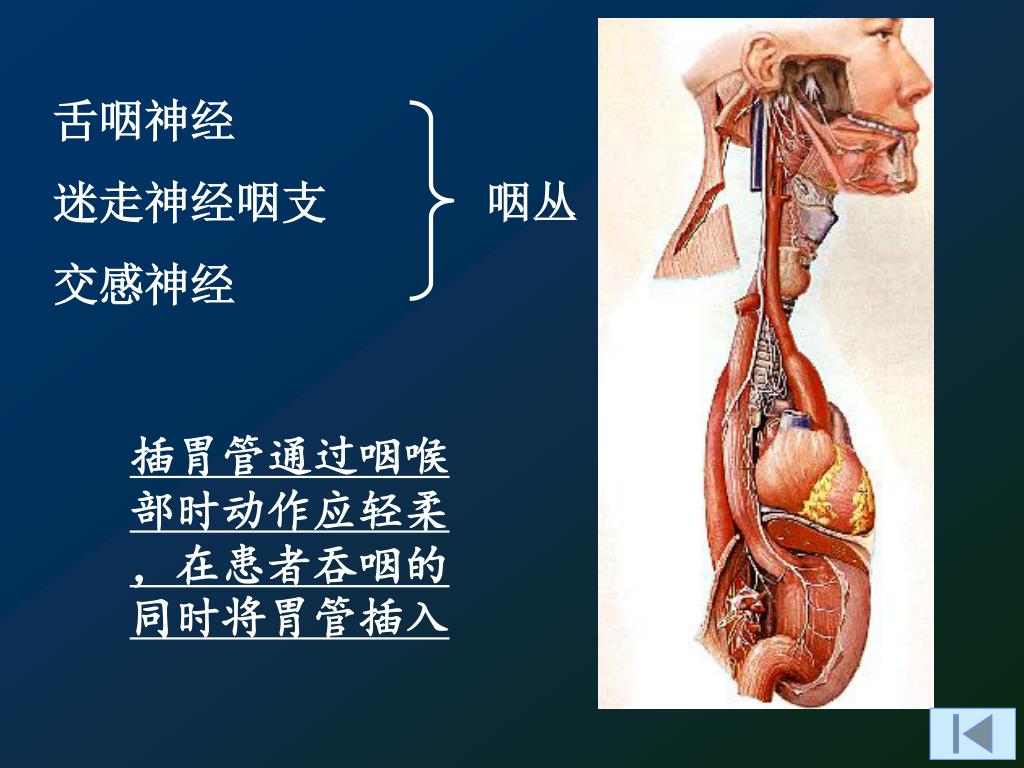 舌咽神经 迷走神经咽支 咽丛 交感神经 插胃管通过咽喉部时动作应轻柔,在患者吞咽的同时将胃管插入