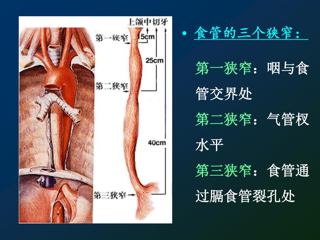 •食管的三个狭窄: 第一狭窄:咽与食 管交界处 第二狭窄:气管杈 水平 第三狭窄:食管通 过膈食管裂孔处