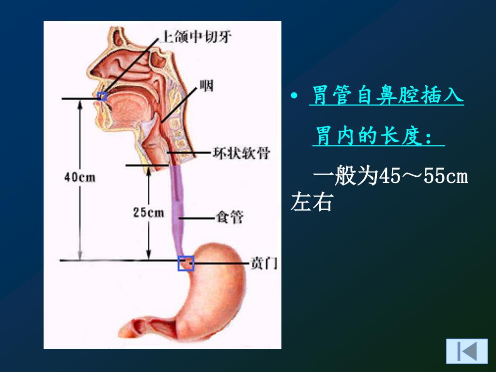•胃管自鼻腔插入 胃内的长度: 一般为45~55cm左右