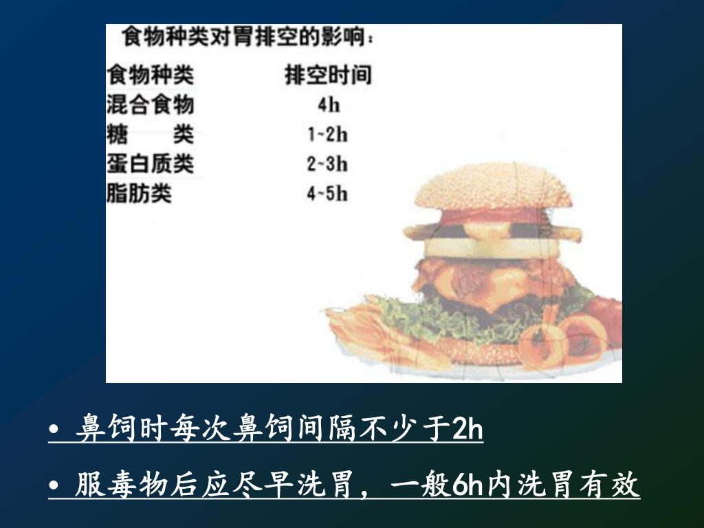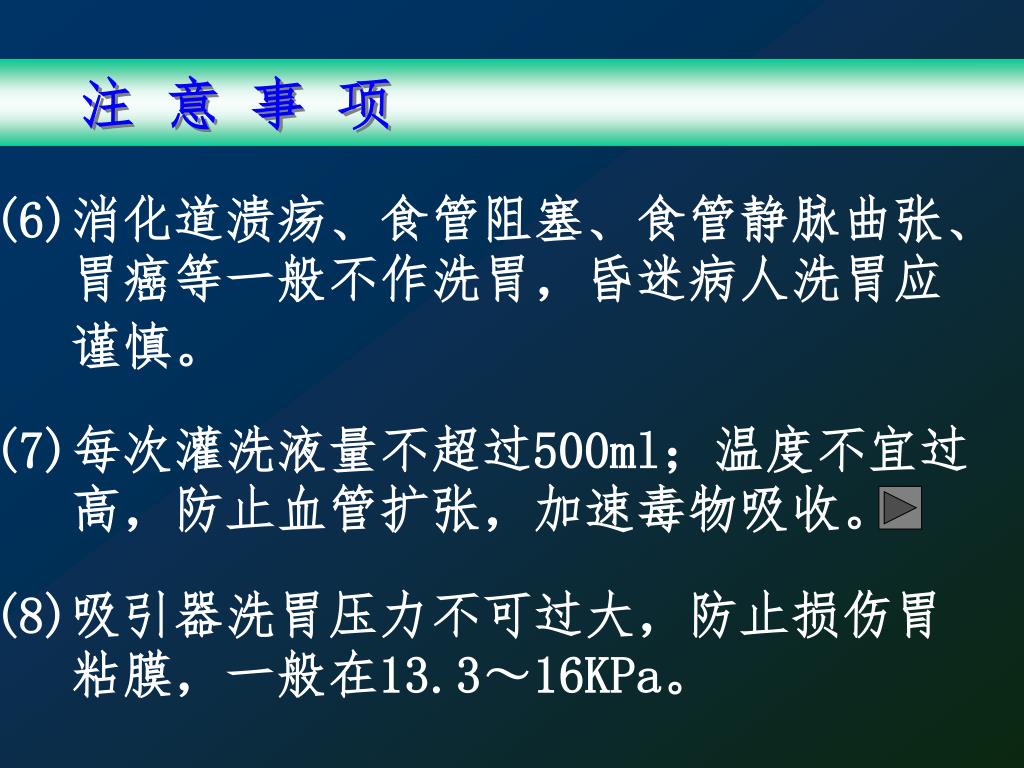 • 鼻饲时每次鼻饲间隔不少于2h •服毒物后应尽早洗胃,一般6h内洗胃有效