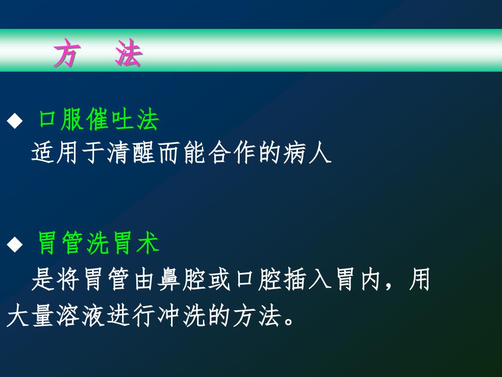 方 法 ◆ 口服催吐法 适用于清醒而能合作的病人 ◆ 胃管洗胃术 是将胃管由鼻腔或口腔插入胃内,用大量溶液进行冲洗的方法。