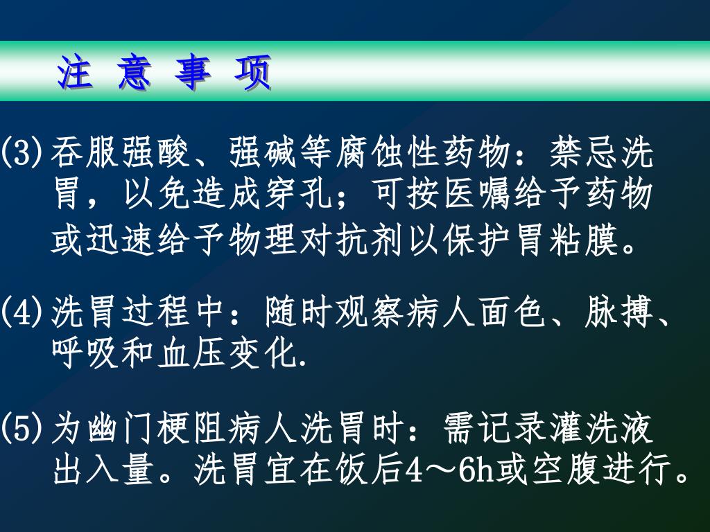 注 意 事 项 (3)吞服强酸、强碱等腐蚀性药物:禁忌洗 胃,以免造成穿孔;可按医嘱给予药物 或迅速给予物理对抗剂以保护胃粘膜。 (4)洗胃过程中:随时观察病人面色、脉搏、 呼吸和血压变化. (5)为幽门梗阻病人洗胃时:需记录灌洗液 出入量。洗胃宜在饭后4~6h或空腹进行。