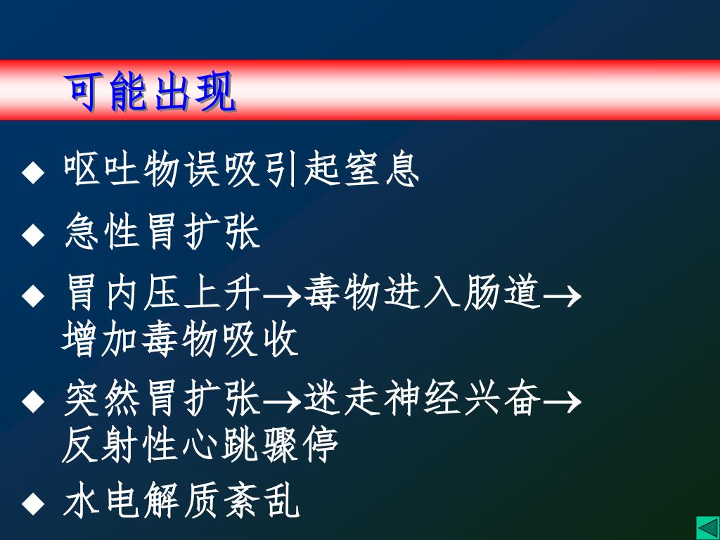 可能出现 ◆ 呕吐物误吸引起窒息 ◆ 急性胃扩张 ◆ 胃内压上升毒物进入肠道 增加毒物吸收 ◆ 突然胃扩张迷走神经兴奋 反射性心跳骤停 ◆ 水电解质紊乱