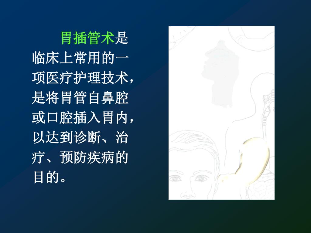 胃插管术是临床上常用的一项医疗护理技术,是将胃管自鼻腔或口腔插入胃内,以达到诊断、治疗、预防疾病的目的。胃插管术是临床上常用的一项医疗护理技术,是将胃管自鼻腔或口腔插入胃内,以达到诊断、治疗、预防疾病的目的。