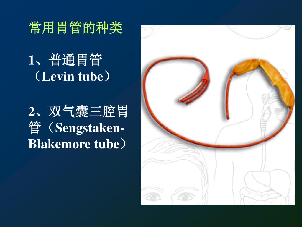 常用胃管的种类 1、普通胃管(Levin tube) 2、双气囊三腔胃管(Sengstaken-Blakemore tube)