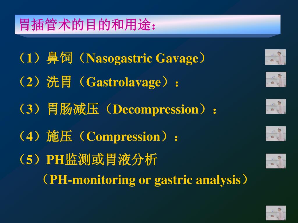 胃插管术的目的和用途: (1)鼻饲(Nasogastric Gavage) (2)洗胃(Gastrolavage): (3)胃肠减压(Decompression): (4)施压(Compression): (5)PH监测或胃液分析 (PH-monitoring or gastric analysis)