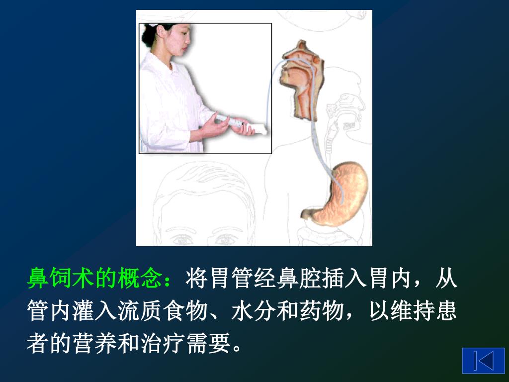 鼻饲术的概念:将胃管经鼻腔插入胃内,从管内灌入流质食物、水分和药物,以维持患者的营养和治疗需要。鼻饲术的概念:将胃管经鼻腔插入胃内,从管内灌入流质食物、水分和药物,以维持患者的营养和治疗需要。