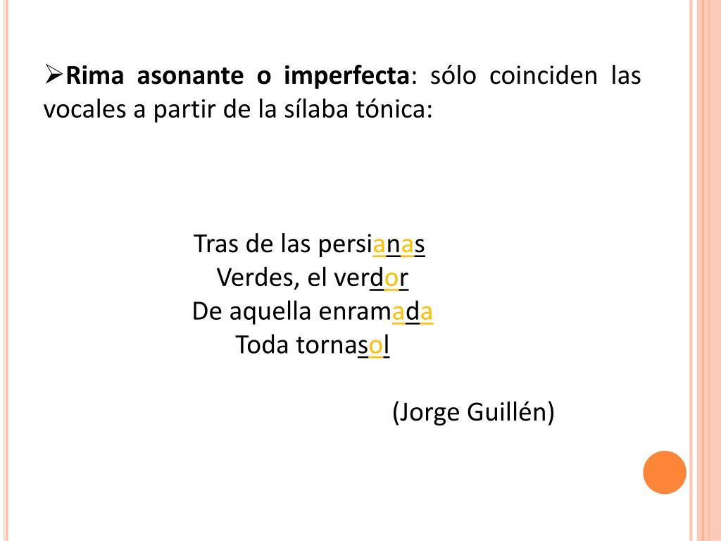 Rima asonante o imperfecta: sólo coinciden las vocales a partir de la sílaba tónica: Tras de las persianas Verdes, el verdor De aquella enramada Toda tornasol (Jorge Guillén)