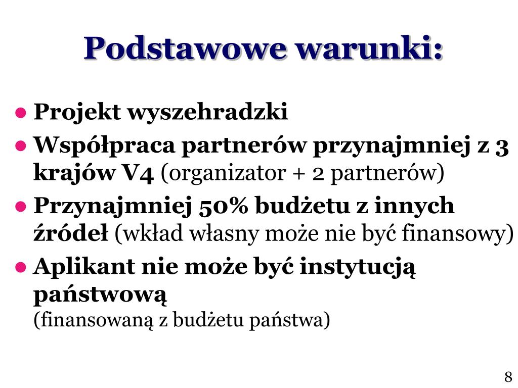 Podstawowe warunki: • Projekt wyszehradzki • Współpraca partnerów przynajmniej z 3 krajów V4 (organizator + 2 partnerów) • Przynajmniej 50% budżetu z innych źródeł(wkład własny może nie być finansowy) • Aplikant nie może być instytucją państwową(finansowaną z budżetu państwa) 8