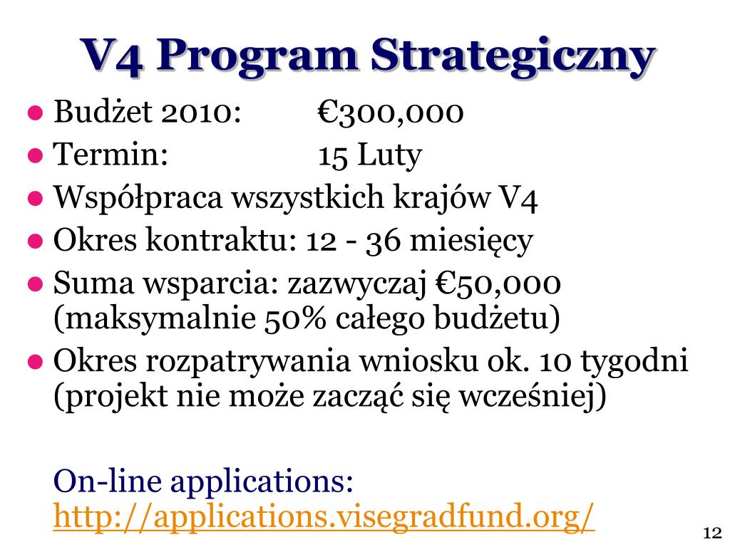 Granty Standardowe • Budżet 2010: €2,200,000 • Terminy: 15 Marzec i 15 Wrzesień • Współpraca przynajmniej 3krajów V4 • Okres kontraktu: 12 miesięcy • Suma wsparcia: od €5,001(maksymalnie 50% całego budżetu) • Czas rozpatrywania wniosków ok. 10 tygodni(projekt nie może zacząć się wcześniej) On-line applications:http://applications.visegradfund.org/ 11