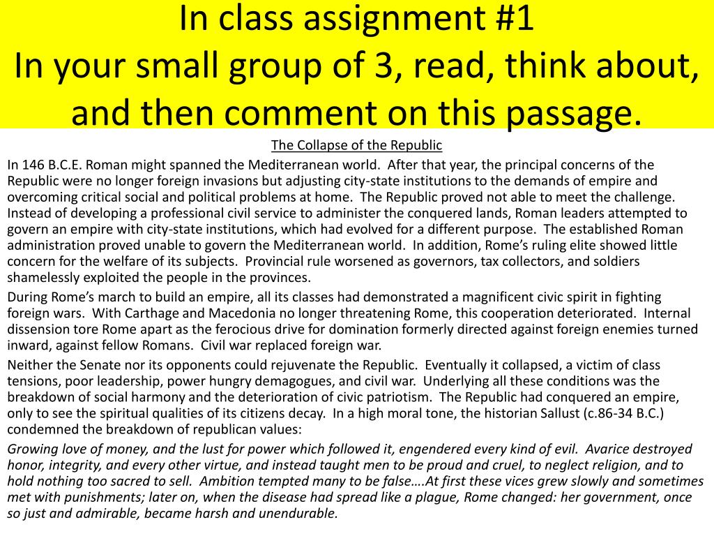 In class assignment #1In your small group of 3, read, think about, and then comment on this passage. The Collapse of the Republic In 146 B.C.E. Roman might spanned the Mediterranean world. After that year, the principal concerns of the Republic were no longer foreign invasions but adjusting city-state institutions to the demands of empire and overcoming critical social and political problems at home. The Republic proved not able to meet the challenge. Instead of developing a professional civil service to administer the conquered lands, Roman leaders attempted to govern an empire with city-state institutions, which had evolved for a different purpose. The established Roman administration proved unable to govern the Mediterranean world. In addition, Rome’s ruling elite showed little concern for the welfare of its subjects. Provincial rule worsened as governors, tax collectors, and soldiers shamelessly exploited the people in the provinces. During Rome’s march to build an empire, all its classes had demonstrated a magnificent civic spirit in fighting foreign wars. With Carthage and Macedonia no longer threatening Rome, this cooperation deteriorated. Internal dissension tore Rome apart as the ferocious drive for domination formerly directed against foreign enemies turned inward, against fellow Romans. Civil war replaced foreign war. Neither the Senate nor its opponents could rejuvenate the Republic. Eventually it collapsed, a victim of class tensions, poor leadership, power hungry demagogues, and civil war. Underlying all these conditions was the breakdown of social harmony and the deterioration of civic patriotism. The Republic had conquered an empire, only to see the spiritual qualities of its citizens decay. In a high moral tone, the historian Sallust (c.86-34 B.C.) condemned the breakdown of republican values: Growing love of money, and the lust for power which followed it, engendered every kind of evil. Avarice destroyed honor, integrity, and every other virtue, and instead taught men to be proud and cruel, to neglect religion, and to hold nothing too sacred to sell. Ambition tempted many to be false….At first these vices grew slowly and sometimes met with punishments; later on, when the disease had spread like a plague, Rome changed: her government, once so just and admirable, became harsh and unendurable.