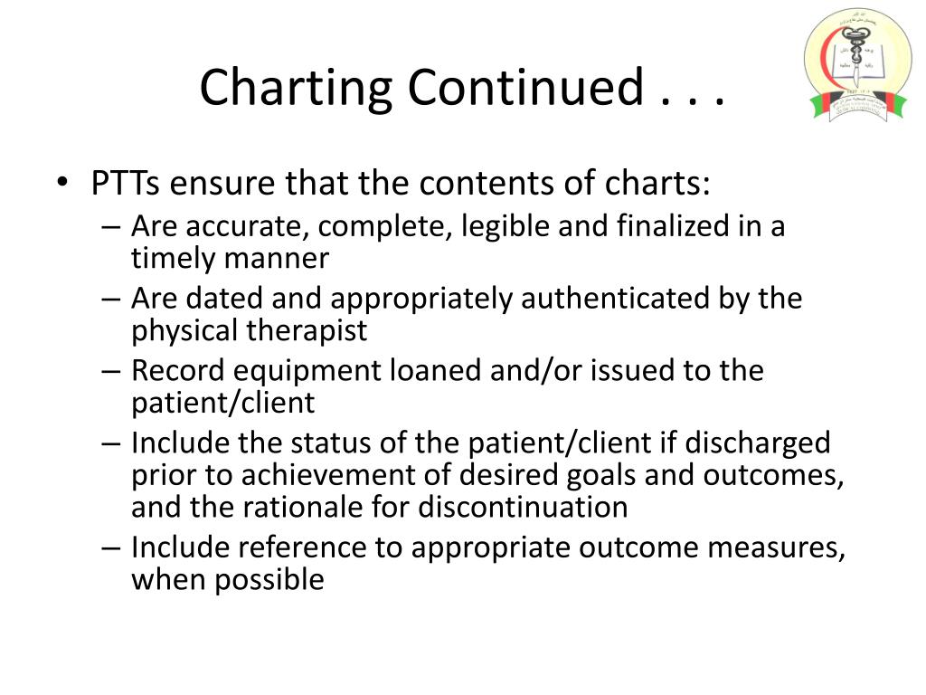 Charting Continued . . . • PTTs ensure that the contents of charts: • Are accurate, complete, legible and finalized in a timely manner • Are dated and appropriately authenticated by the physical therapist • Record equipment loaned and/or issued to the patient/client • Include the status of the patient/client if discharged prior to achievement of desired goals and outcomes, and the rationale for discontinuation • Include reference to appropriate outcome measures, when possible