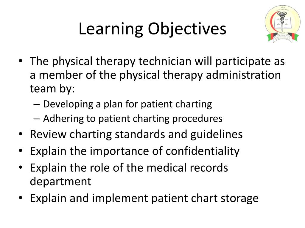 PO-006.01:Physical Therapy Administration. Learning Objectives . The physical therapy technician will participate as a member of the physical therapy administration team by: Developing a plan for patient charting Adhering to patient charting procedures Review charting standards and guidelines