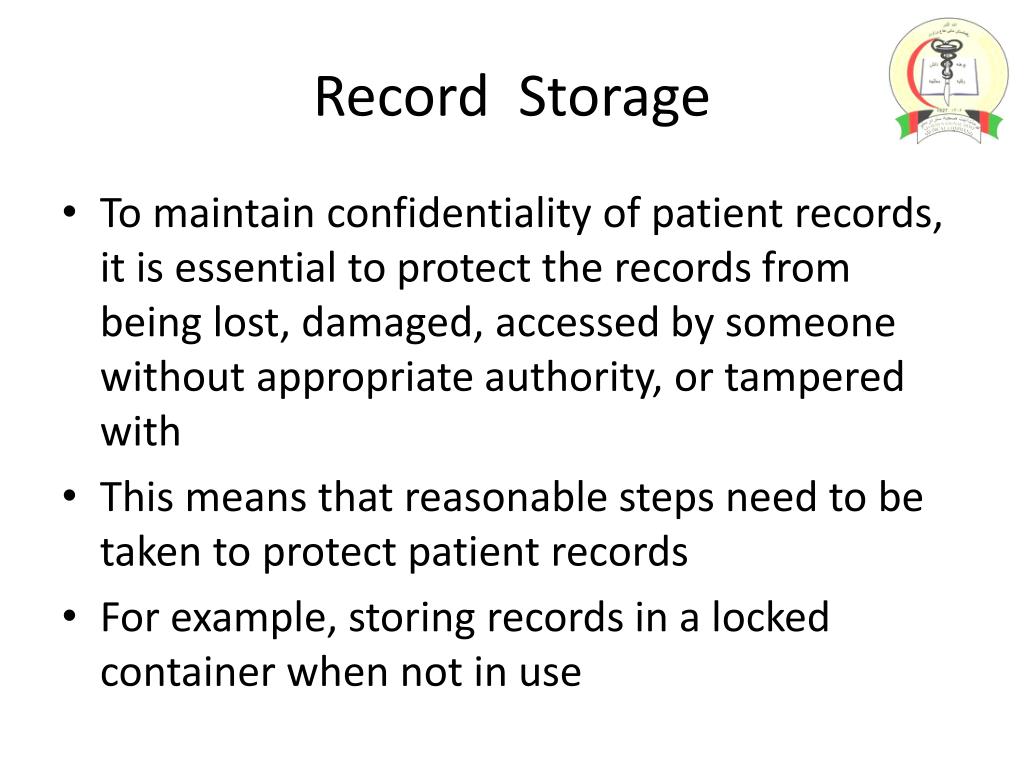 Record Storage • To maintain confidentiality of patient records, it is essential to protect the records from being lost, damaged, accessed by someone without appropriate authority, or tampered with • This means that reasonable steps need to be taken to protect patient records • For example, storing records in a locked container when not in use