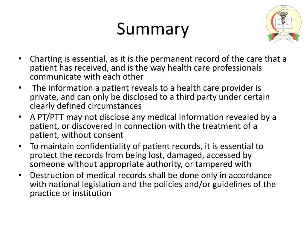 Summary • Charting is essential, as it is the permanent record of the care that a patient has received, and is the way health care professionals communicate with each other • The information a patient reveals to a health care provider is private, and can only be disclosed to a third party under certain clearly defined circumstances • A PT/PTT may not disclose any medical information revealed by a patient, or discovered in connection with the treatment of a patient, without consent • To maintain confidentiality of patient records, it is essential to protect the records from being lost, damaged, accessed by someone without appropriate authority, or tampered with • Destruction of medical records shall be done only in accordance with national legislation and the policies and/or guidelines of the practice or institution