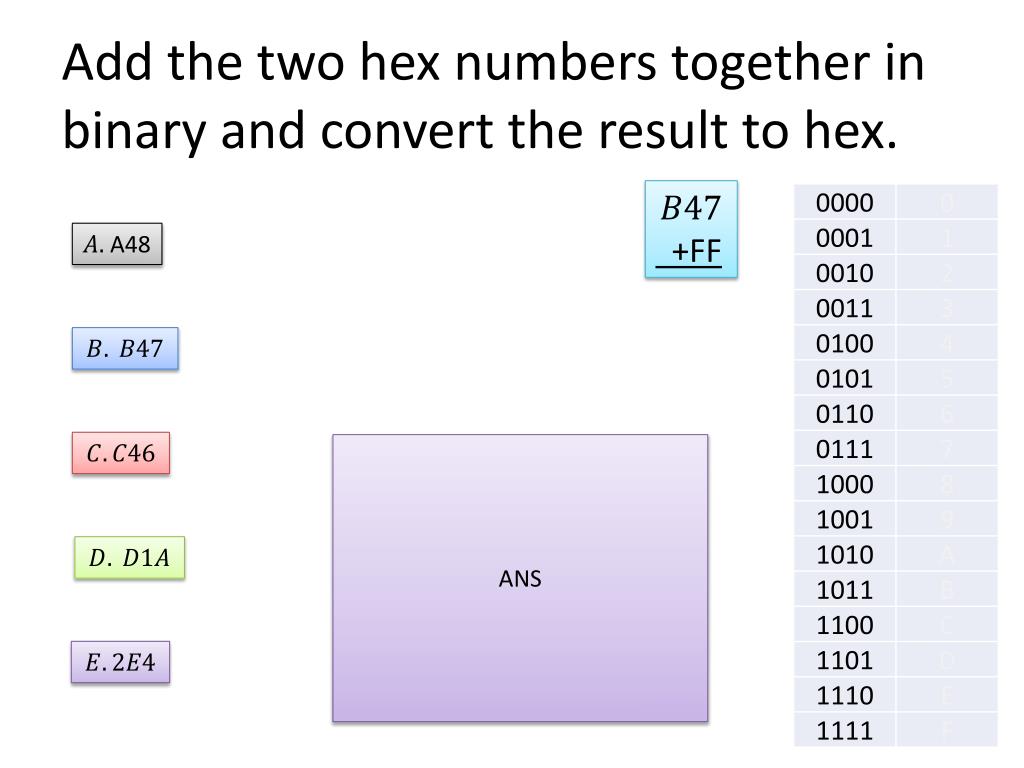 Add the two hex numbers together in binary and convert the result to hex. +FF A48 1011 ANS +