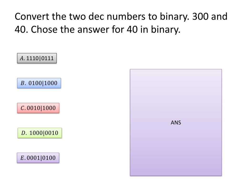 Convert the two dec numbers to binary. 300 and 40. Chose the answer for 40 in binary. 1110|0111 ANS