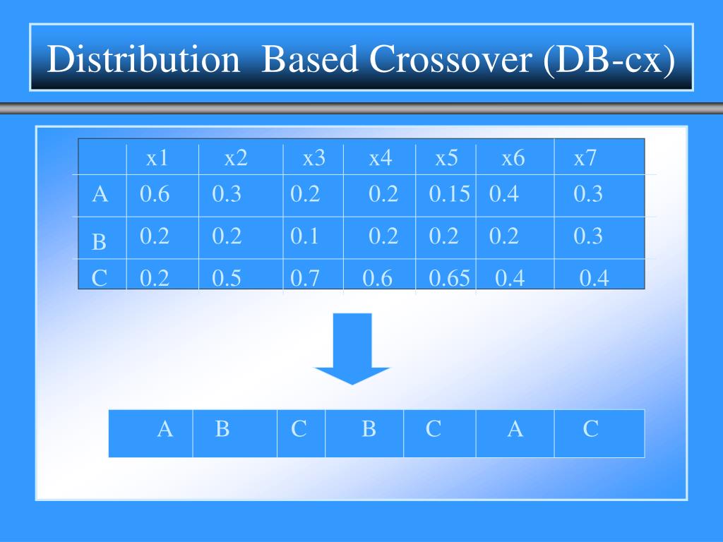 Distribution Based Crossover (DB-cx) x1 x2 x3 x4 x5 x6 x7 A 0.6 0.3 0.2 0.2 0.15 0.4 0.3 0.2 0.2 0.1 0.2 0.2 0.2 0.3 B C 0.2 0.5 0.7 0.6 0.65 0.4 0.4 A B C B C A C