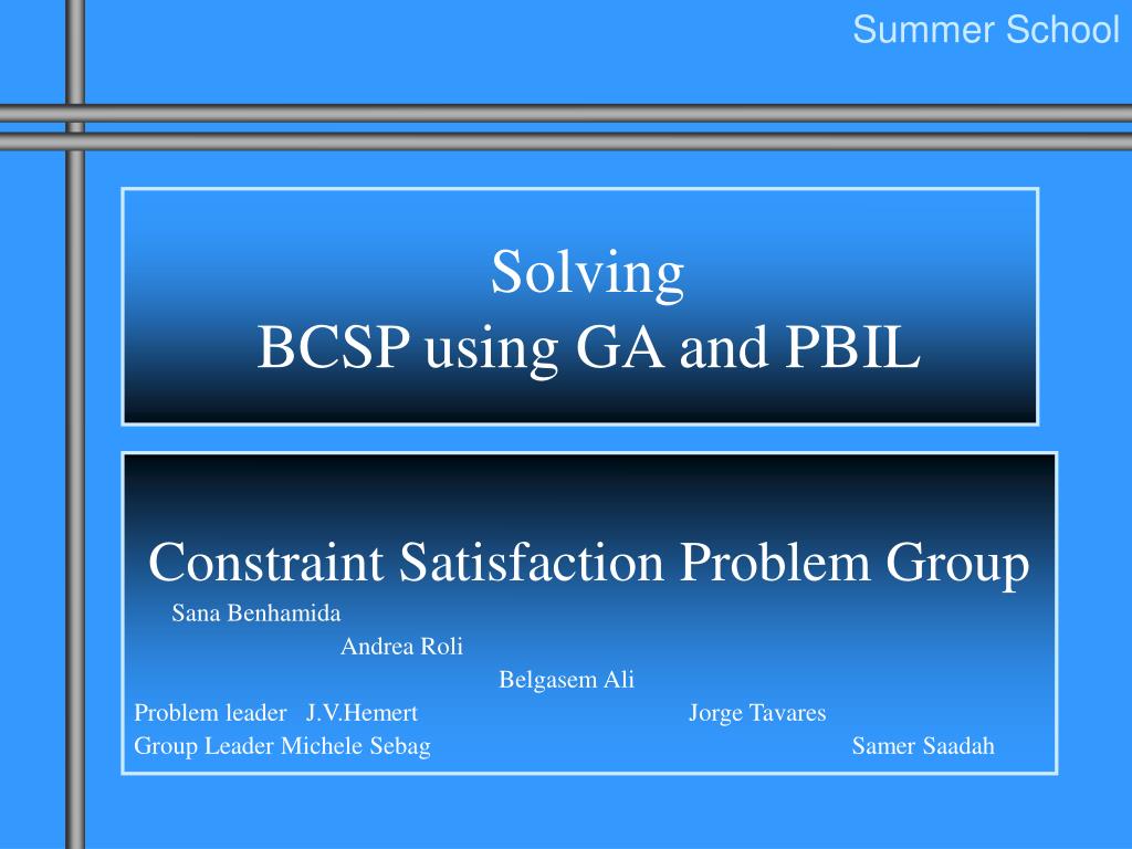 Summer School Solving BCSP using GA and PBIL Constraint Satisfaction Problem Group Sana Benhamida Andrea Roli Belgasem Ali Problem leader J.V.Hemert Jorge Tavares Group Leader Michele Sebag Samer Saadah