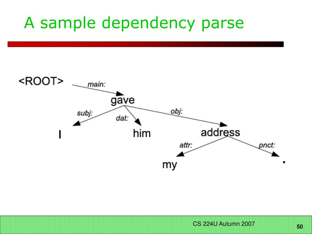 Quick background: Dependency Parsing • Among the earliest kinds of parsers in NLP • Drew linguistic insights from the work of L. Tesniere (1959) • David Hays, one of the founders of computational linguistics, built early (first?) dependency parser (Hays 1962) • The idea dates back to the ancient Greek and Indian grammarians of “parsing” into subject and predicate • A sentence is parsed by relating each word to other words in the sentence which depend on it.