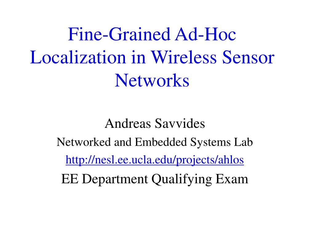Fine-Grained Ad-Hoc Localization in Wireless Sensor Networks Andreas Savvides Networked and Embedded Systems Lab http://nesl.ee.ucla.edu/projects/ahlos EE Department Qualifying Exam