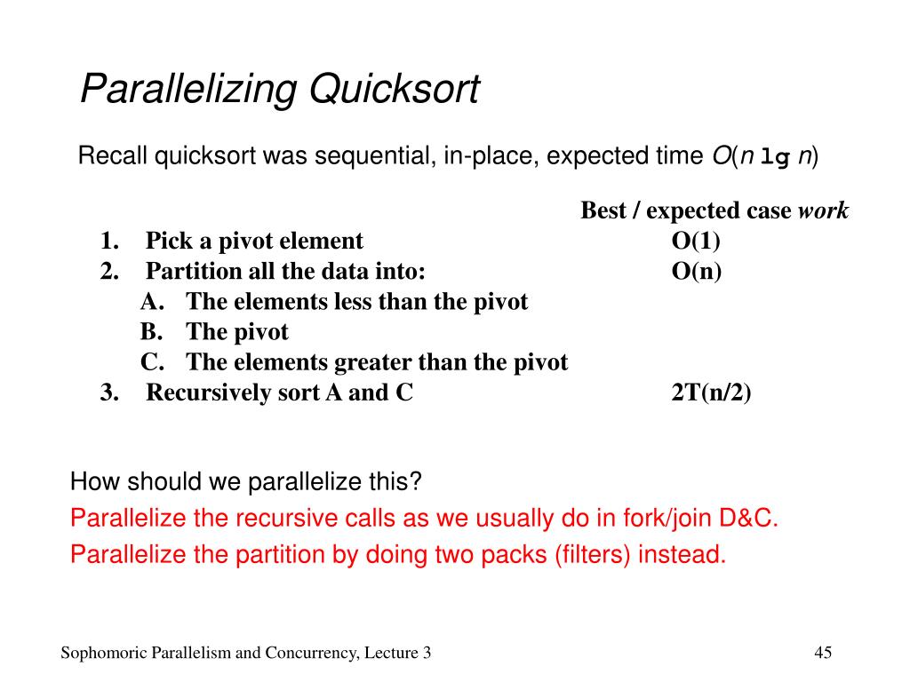 Parallelizing Quicksort • Best / expected case work • Pick a pivot element O(1) • Partition all the data into: O(n) • The elements less than the pivot • The pivot • The elements greater than the pivot • Recursively sort A and C 2T(n/2) How should we parallelize this? Parallelize the recursive calls as we usually do in fork/join D&C. Parallelize the partition by doing two packs (filters) instead. Recall quicksort was sequential, in-place, expected time O(n lgn) Sophomoric Parallelism and Concurrency, Lecture 3