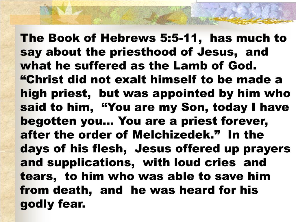 El Libro de Hebreos 5:5-11, tiene mucho que decir acerca del sacerdocio de Jesús, y lo que sufrió como Cordero de Dios. “Cristo no se apropio la gloria del Sumo Sacerdocio, sino que la tuvo de quien le dijo: Hijo mío eres tu; Yo te he engendrado hoy. Como también dice en otro lugar, Tu eres sacerdote para siempre, a semejanza de Melquisedec. El cual, habiendo ofrecido en los días de su vida mortal ruegos y suplicas con poderoso clamor y lagrimas al que podía salvarle de la muerte, fue escuchado por su actitud reverente.