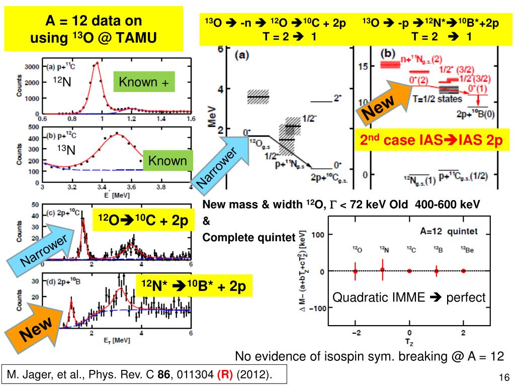 13O -n 12O 10C + 2p 13O -p 12N*10B*+2p T = 2 1 T = 2 1 A = 12 data onusing 13O @ TAMU Known + 12N New mass & width 12O, G < 72 keV Old 400-600 keV & Complete quintet New 2nd case IASIAS 2p 13N Known Narrower 12O10C + 2p Narrower 12N* 10B* + 2p Quadratic IMME perfect New No evidence of isospin sym. breaking @ A = 12 M. Jager, et al., Phys. Rev. C 86, 011304 (R) (2012).