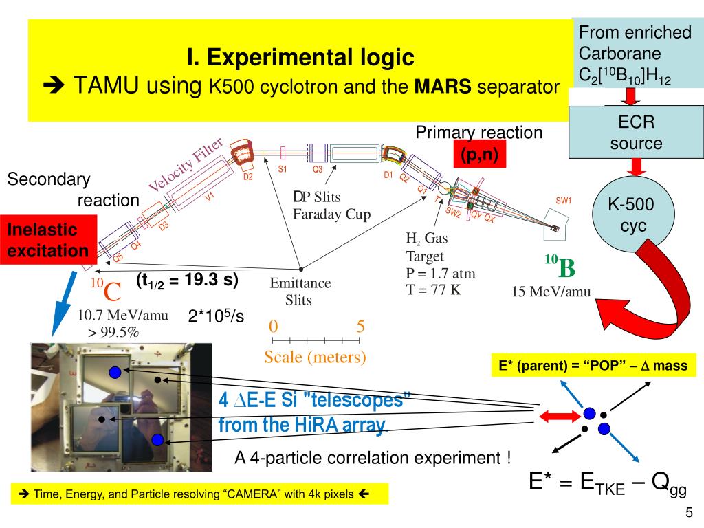 From enriched Carborane C2[10B10]H12 I. Experimental logic TAMU using K500 cyclotron and the MARS separator ECR source Primary reaction (p,n) Secondary reaction K-500 cyc Inelastic excitation (t1/2 = 19.3 s) 2*105/s E* (parent) = “POP” – D mass A 4-particle correlation experiment ! E* = ETKE – Qgg Time, Energy, and Particle resolving “CAMERA” with 4k pixels