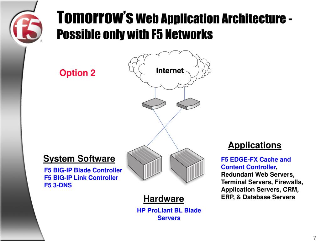 Tomorrow’s Web Application Architecture Internet Option 1 Routers 3-DNS BIG-IP Link Controller 2000s Firewalls BIG-IP 5000s EDGE-FX Applications Hardware Redundant Web Servers, Terminal Servers, Application Servers, CRM, ERP, & Database Servers Blade Server Systems