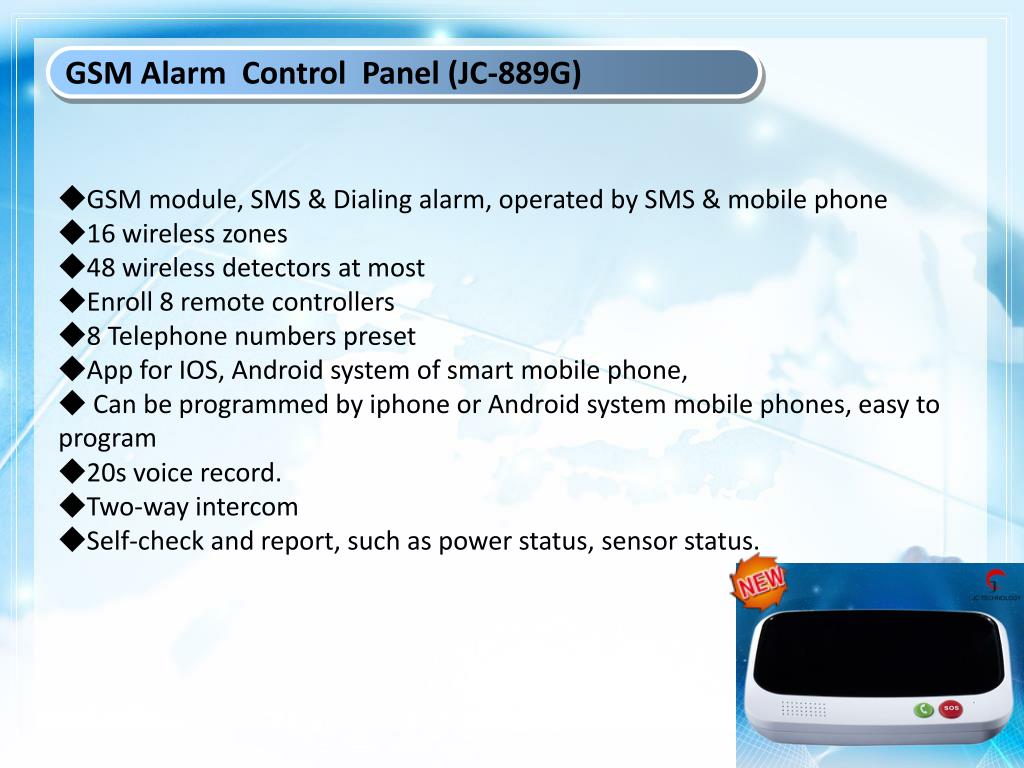 GSM Alarm Control Panel (JC-889G) ◆GSM module, SMS & Dialing alarm, operated by SMS & mobile phone ◆16 wireless zones ◆48 wireless detectors at most ◆Enroll 8 remote controllers ◆8 Telephone numbers preset ◆App for IOS, Android system of smart mobile phone, ◆ Can be programmed by iphone or Android system mobile phones, easy to program ◆20s voice record. ◆Two-way intercom ◆Self-check and report, such as power status, sensor status.