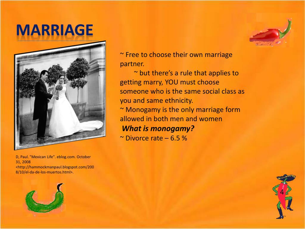Marriage ~ Free to choose their own marriage partner. ~ but there’s a rule that applies to getting marry, YOU must choose someone who is the same social class as you and same ethnicity. ~ Monogamy is the only marriage form allowed in both men and women What is monogamy? ~ Divorce rate – 6.5 % D, Paul. "Mexican Life". eblog.com. October 31, 2008 <http://hammockmanpaul.blogspot.com/2008/10/el-da-de-los-muertos.html>. 4
