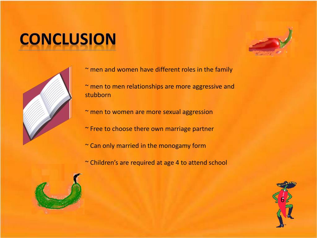 Conclusion ~ men and women have different roles in the family ~ men to men relationships are more aggressive and stubborn ~ men to women are more sexual aggression ~ Free to choose there own marriage partner ~ Can only married in the monogamy form ~ Children’s are required at age 4 to attend school 6