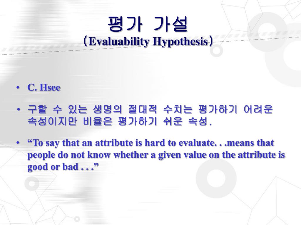 평가 가설(Evaluability Hypothesis) • C. Hsee • 구할 수 있는 생명의 절대적 수치는 평가하기 어려운속성이지만 비율은 평가하기 쉬운 속성. • “To say that an attribute is hard to evaluate. . .means that people do not know whether a given value on the attribute is good or bad . . .”