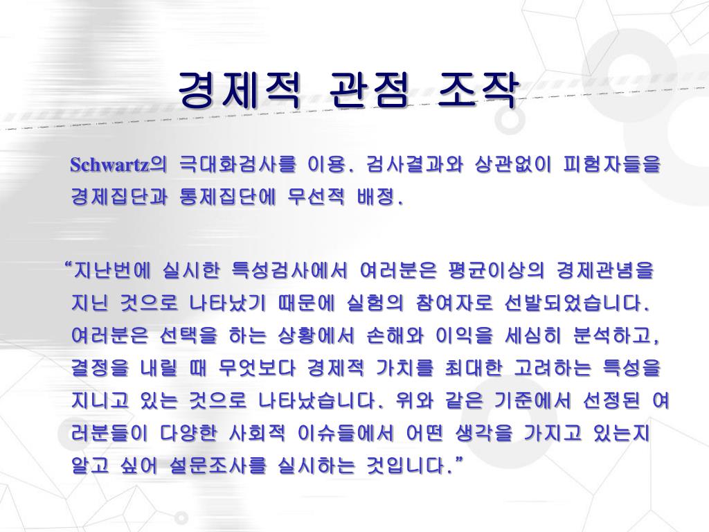 경제적 관점 조작 Schwartz의 극대화검사를 이용. 검사결과와 상관없이 피험자들을 경제집단과 통제집단에 무선적 배정. “지난번에 실시한 특성검사에서 여러분은 평균이상의 경제관념을 지닌 것으로 나타났기 때문에 실험의 참여자로 선발되었습니다. 여러분은 선택을 하는 상황에서 손해와 이익을 세심히 분석하고, 결정을 내릴 때 무엇보다 경제적 가치를 최대한 고려하는 특성을 지니고 있는 것으로 나타났습니다. 위와 같은 기준에서 선정된 여러분들이 다양한 사회적 이슈들에서 어떤 생각을 가지고 있는지 알고 싶어 설문조사를 실시하는 것입니다.”