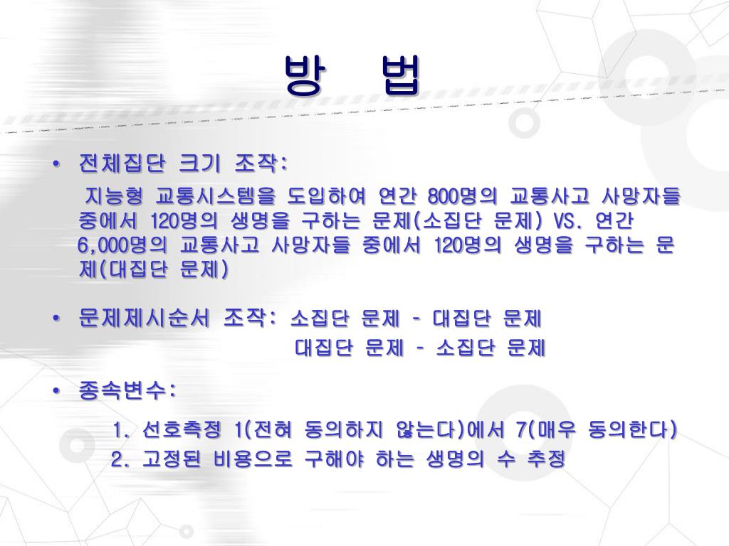 방 법 • 전체집단 크기 조작: 지능형 교통시스템을 도입하여 연간 800명의 교통사고 사망자들 중에서 120명의 생명을 구하는 문제(소집단 문제) VS. 연간 6,000명의 교통사고 사망자들 중에서 120명의 생명을 구하는 문제(대집단 문제) • 문제제시순서 조작: 소집단 문제 – 대집단 문제 대집단 문제 – 소집단 문제 • 종속변수: 1. 선호측정 1(전혀 동의하지 않는다)에서 7(매우 동의한다) 2. 고정된 비용으로 구해야 하는 생명의 수 추정