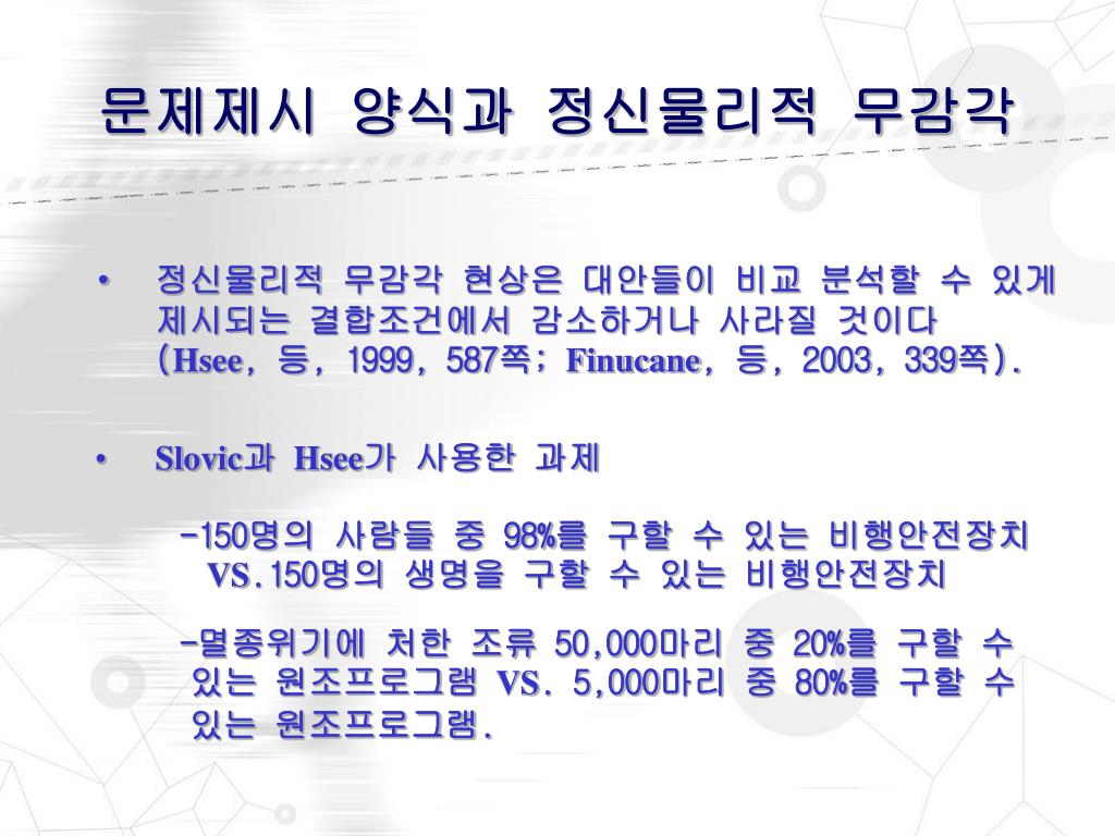 문제제시 양식과 정신물리적 무감각 • 정신물리적 무감각 현상은 대안들이 비교 분석할 수 있게 제시되는 결합조건에서 감소하거나 사라질 것이다(Hsee, 등, 1999, 587쪽; Finucane, 등, 2003, 339쪽). • Slovic과 Hsee가 사용한 과제 -150명의 사람들 중 98%를 구할 수 있는 비행안전장치 VS.150명의 생명을 구할 수 있는 비행안전장치 -멸종위기에 처한 조류 50,000마리 중 20%를 구할 수 있는 원조프로그램 VS. 5,000마리 중 80%를 구할 수 있는 원조프로그램.