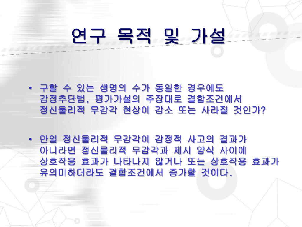 연구 목적 및 가설 • 구할 수 있는 생명의 수가 동일한 경우에도감정추단법, 평가가설의 주장대로 결합조건에서정신물리적 무감각 현상이 감소 또는 사라질 것인가? • 만일 정신물리적 무감각이 감정적 사고의 결과가아니라면 정신물리적 무감각과 제시 양식 사이에상호작용 효과가 나타나지 않거나 또는 상호작용 효과가 유의미하더라도 결합조건에서 증가할 것이다.