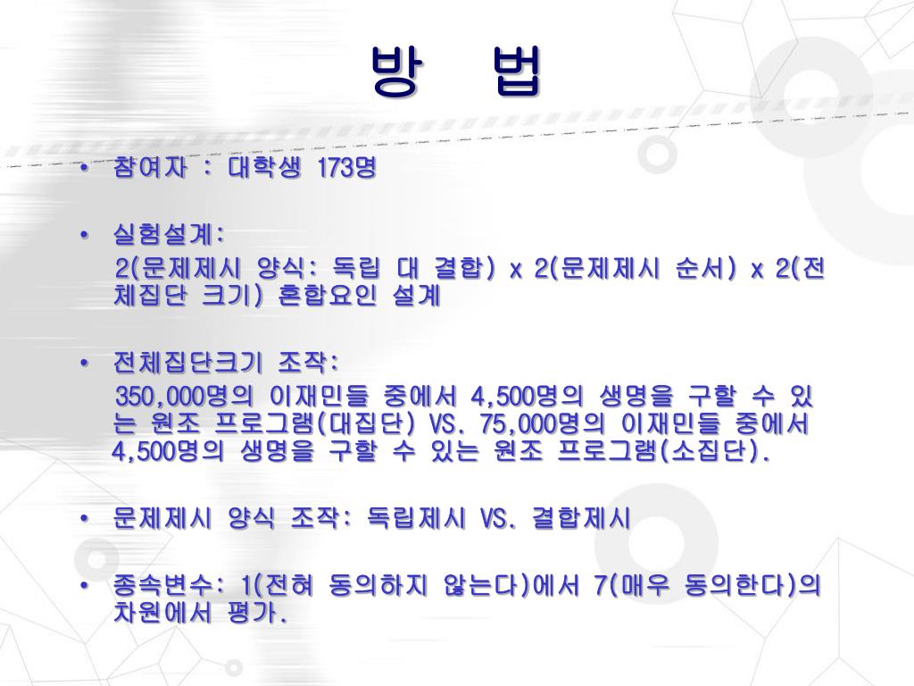 방 법 • 참여자 : 대학생 173명 • 실험설계: 2(문제제시 양식: 독립 대 결합) x 2(문제제시 순서) x 2(전체집단 크기) 혼합요인 설계 • 전체집단크기 조작: 350,000명의 이재민들 중에서 4,500명의 생명을 구할 수 있는 원조 프로그램(대집단) VS. 75,000명의 이재민들 중에서 4,500명의 생명을 구할 수 있는 원조 프로그램(소집단). • 문제제시 양식 조작: 독립제시 VS. 결합제시 • 종속변수: 1(전혀 동의하지 않는다)에서 7(매우 동의한다)의 차원에서 평가.