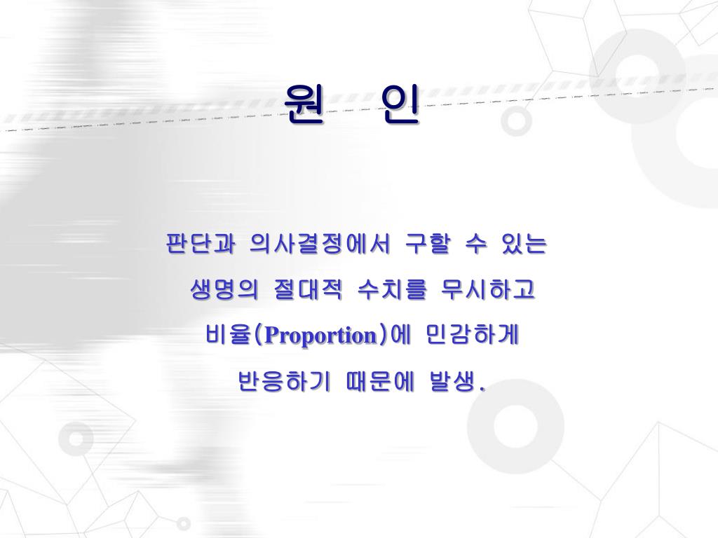 원 인 판단과 의사결정에서 구할 수 있는 생명의 절대적 수치를 무시하고 비율(Proportion)에 민감하게 반응하기 때문에 발생.