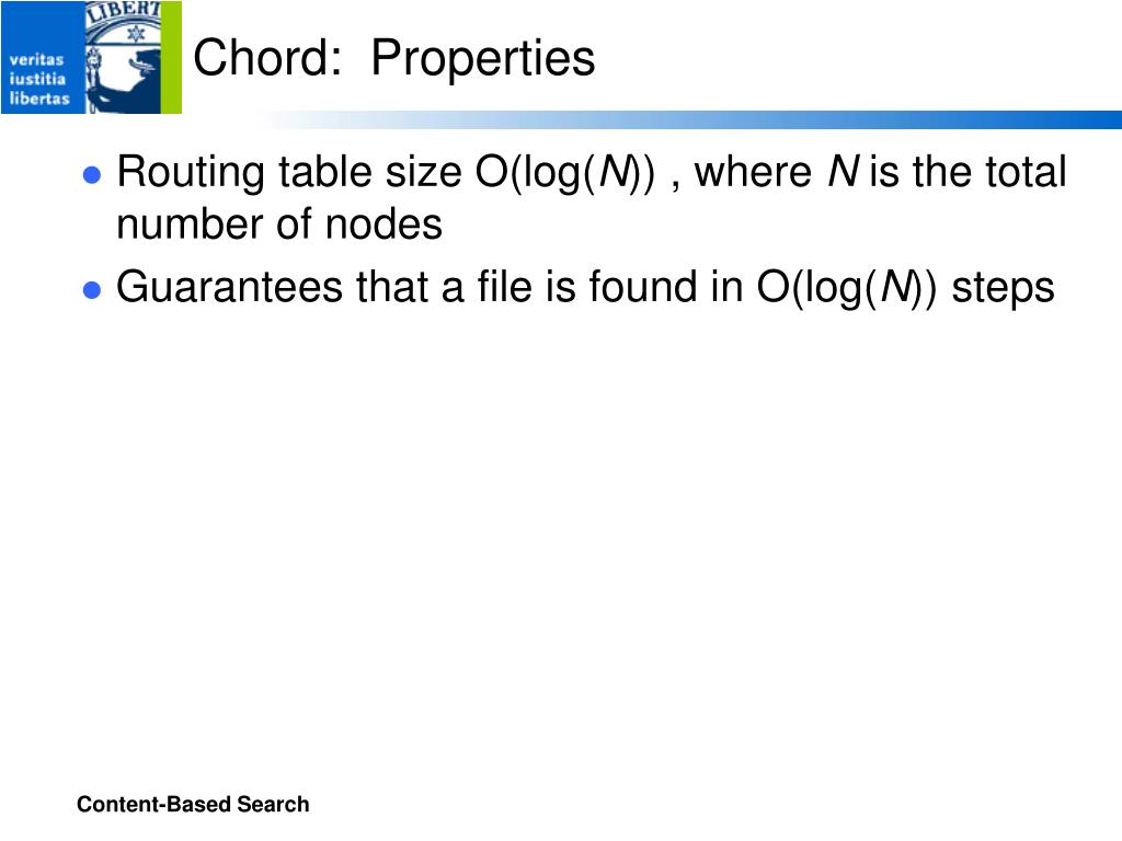 Chord: Properties • Routing table size O(log(N)) , where N is the total number of nodes • Guarantees that a file is found in O(log(N)) steps Content-Based Search