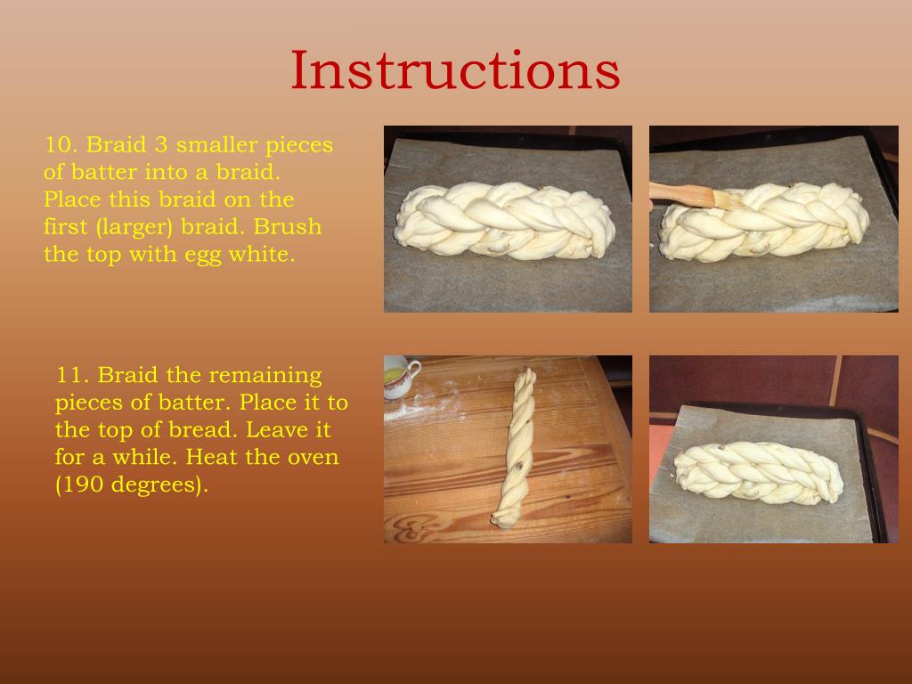 Instructions 10. Braid 3 smallerpiecesofbatterinto a braid. Place thisbraid on thefirst (larger) braid. Brushthe top witheggwhite. 11. Braidtheremainingpiecesofbatter. Place it to the top ofbread. Leaveitfor a while. Heat theoven (190 degrees).