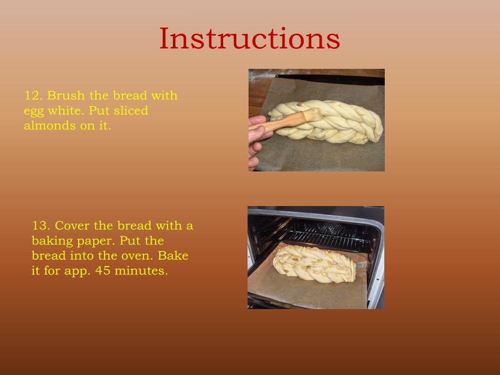 Instructions 12. Brushthebreadwitheggwhite. Putslicedalmonds on it. 13. Coverthebreadwith a bakingpaper. Putthebreadintotheoven. Bakeitforapp. 45 minutes.