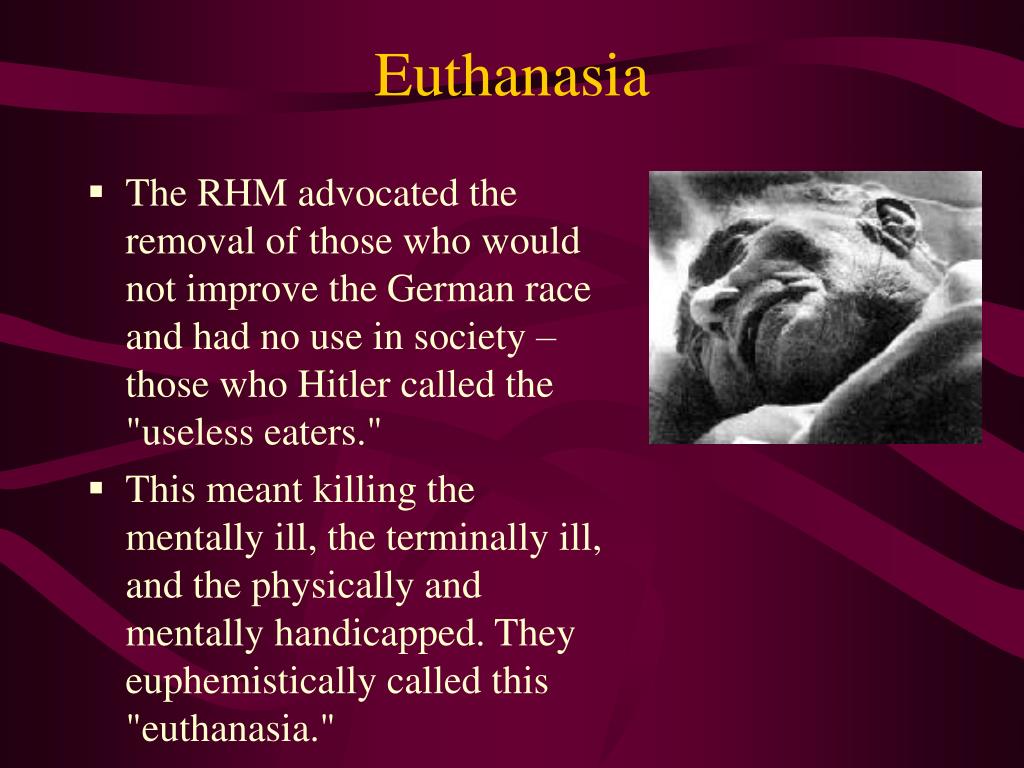 Euthanasia • The RHM advocated the removal of those who would not improve the German race and had no use in society – those who Hitler called the "useless eaters." • This meant killing the mentally ill, the terminally ill, and the physically and mentally handicapped. They euphemistically called this "euthanasia."