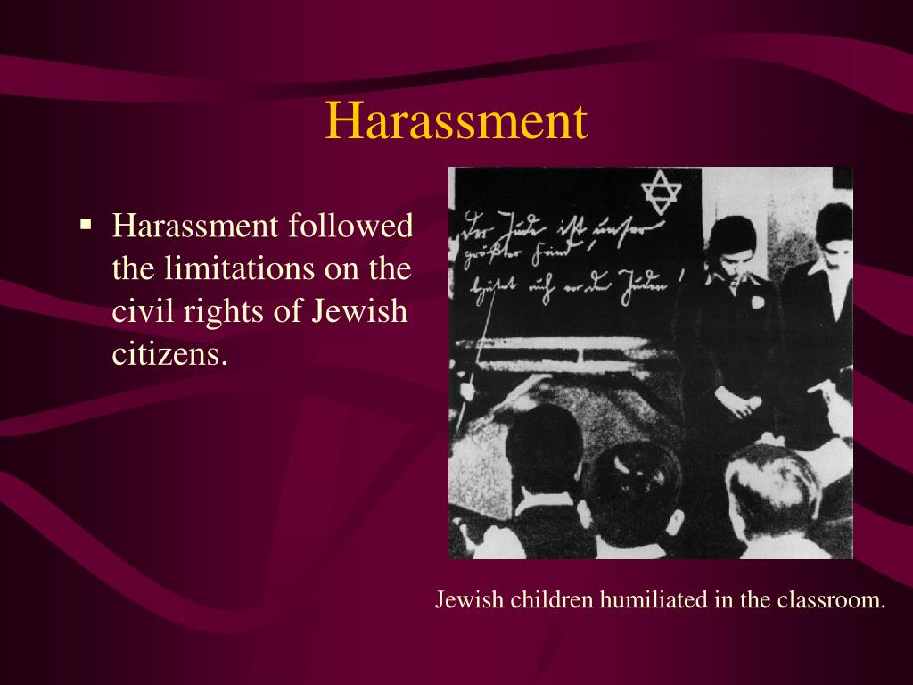 Harassment • Harassment followed the limitations on the civil rights of Jewish citizens. Jewish children humiliated in the classroom.